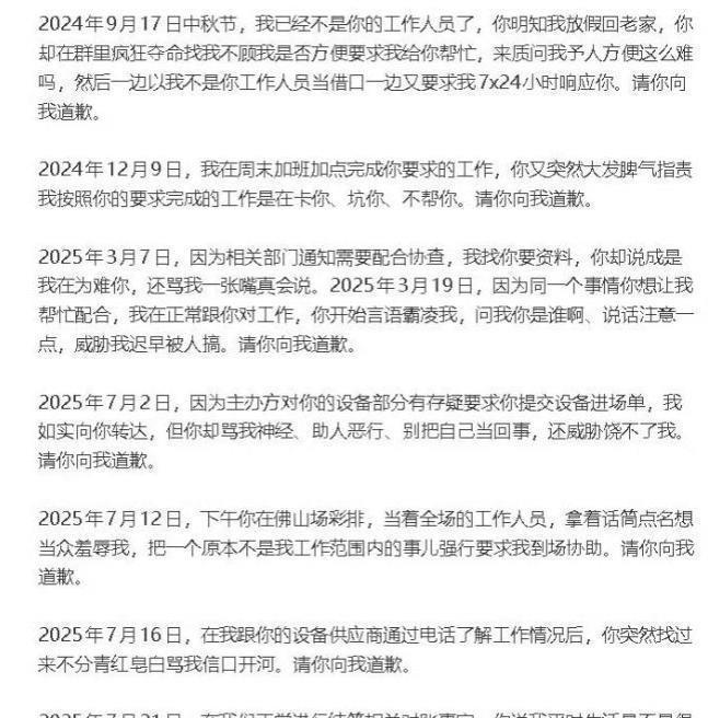 2025年佛山彩排更是让人大开眼界。她拿话筒当众点名羞辱人,还把根本不归那位员工管的事硬塞给人家。人家婉拒拍额外视频,她一句“tmd不演了”甩出来,演出差点黄掉。威胁也不少,“饶不了你”这种话随口就来。最让人寒心的是,公司居然发函让她“闭嘴”,可人家偏不,撂下一句“再举报,我再发”,手里还存着录音证据,就等一个道歉。