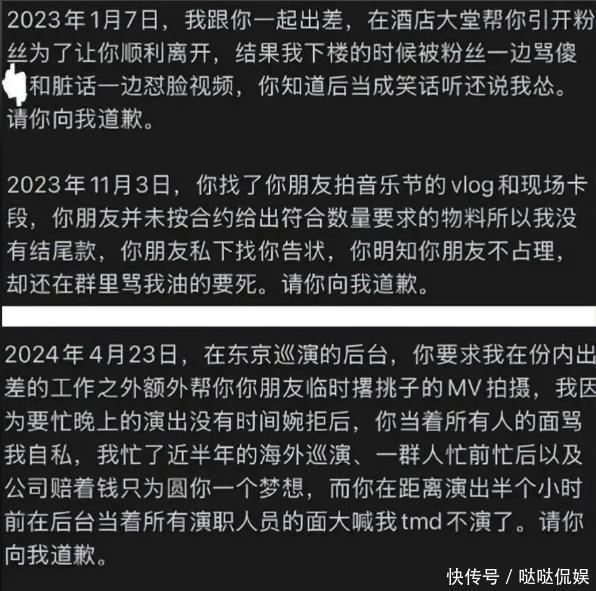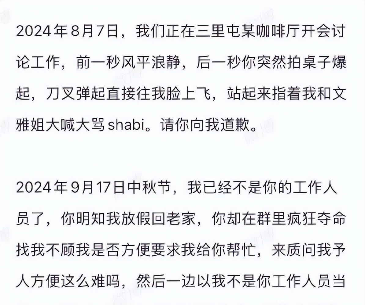 最近那篇题为《“现在的208到底在高贵什么”》的长文炸了圈。一位自称2021到2025年间与她合作的前员工,把后台的混乱全掀了出来。说2022年她要求员工私聊粉丝被拒后,当场在群里发飙,“你有没有资格说这句话!”语气冲得像炸药桶一点就着。到了2023年,朋友拍物料没达标,尾款该不该付本是商量的事,结果她不管合同不合同,直接骂工作人员“油的要死”。更离谱的是2024年三里屯咖啡厅开会,说着说着突然拍桌子,刀叉都飞起来差点打到人脸上,嘴里还不停地吼。这哪是讨论工作,简直像战场。